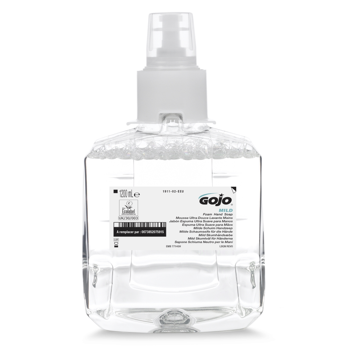 GOJO® Extra Milde Schaumseife Nachfüllung 1.200ml für GOJO® LTX-12™ berührungsloser Schaumseifenspender. GOJO Extra Milde Schaumseife ist extrem sanft zur Haut ist und enthält keine Duft- oder Farbstoffe. Sie ist mild genug für sehr häufiges Händewaschen. Ecolabelzertifiziert. Mit GOJO SMART-FLEX-Technologie hergestellte Nachfüllpacks. GOJO SANITARY SEALED Nachfüllpacks – rasten einfach und schnell ein. Sie schützen Benutzer vor den Risiken der Kontamination aus Seifenkanistern. Controlled collapse Nachfüllungen – die zum Patent angemeldeten Nachfüllpacks behalten beim Entleeren Ihre Form.